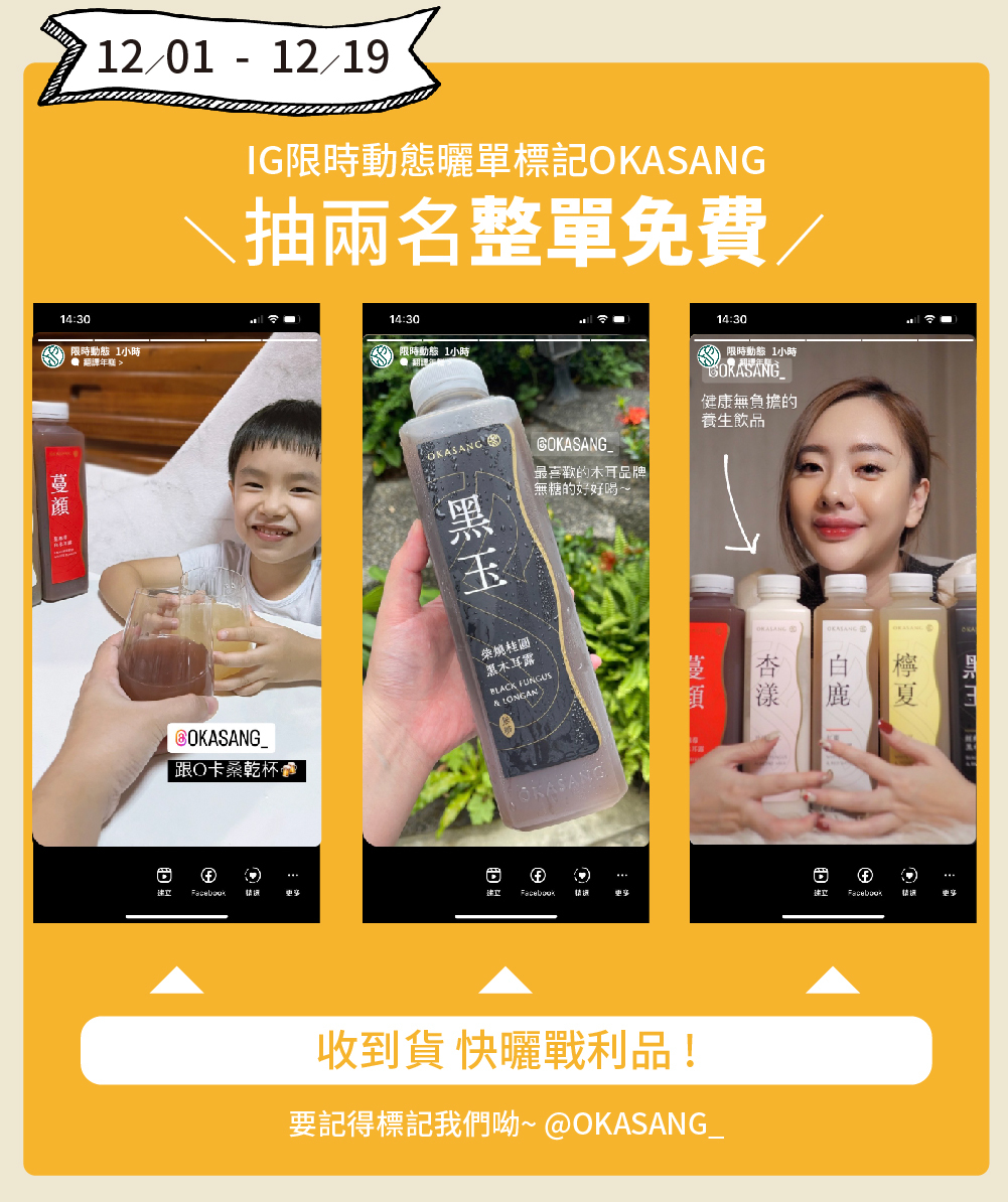1.請於12/1-12/19,IG限時動態分享戰利品並標記@okasang_