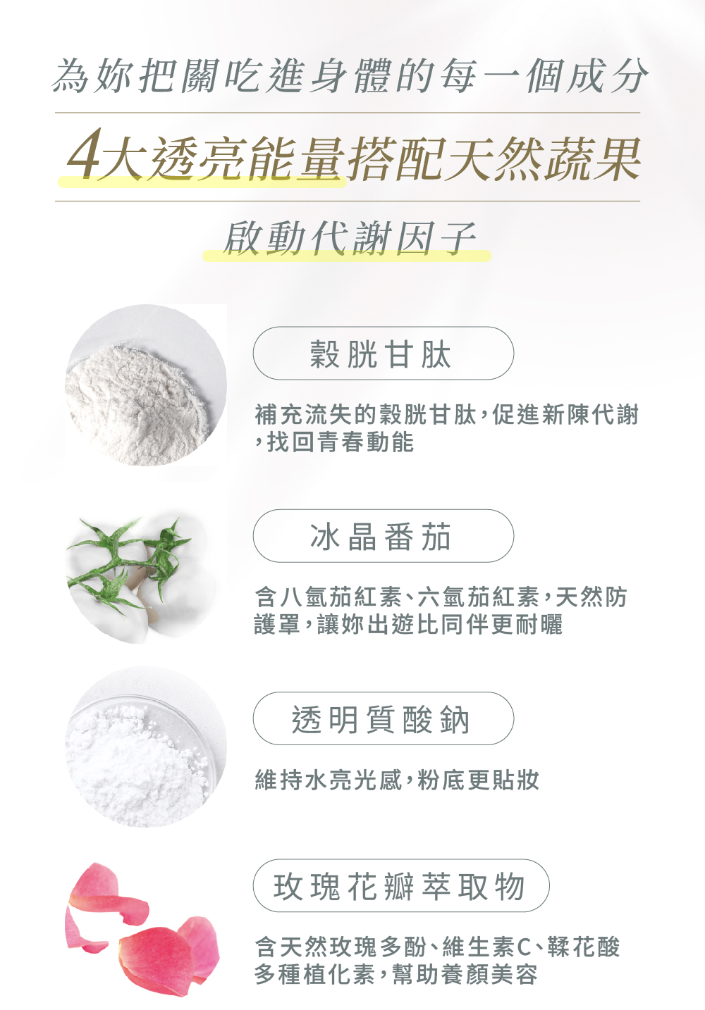 🎖4大透亮食材冰晶番茄、玫瑰花、鏈球菌發酵物、穀胱甘肽